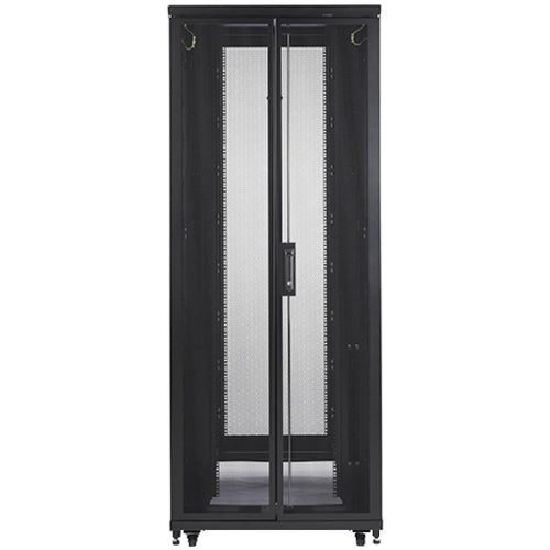 Wide Universal IT enclosure with increased cable management options for denser server and networking applications. Includes integrated vertical 1U mounting spaces adjacent the enclosures standard EIA-310 equipment mounting u-spaces that can be removed and replaced with 1U accessories.42U height to easily roll through doorways.