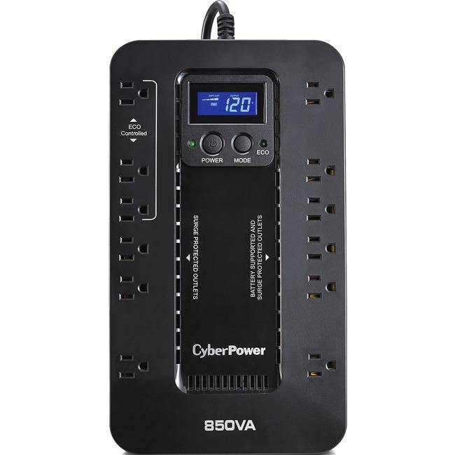 A compact UPS with standby topology, the CyberPower Ecologic EC850LCD provides battery backup (using simulated sine wave output) and surge protection for desktop computers, workstations, networking devices, and home entertainment systems. During power interruptions, the EC850LCD offers reliable power protection and battery backup. When the battery backup detects that the computer is off or in sleep mode, computer peripherals connected to the ECO Mode, surge protected outlets will be automatically turned off, reducing power usage and lowering energy costs (USB connection required). The multifunction LCD provides immediate, detailed information about the UPS battery and power conditions and generates alerts of potential problems before they can affect critical equipment and cause downtime. The EC850LCD comes with a three-year warranty (including coverage of batteries) and a ,100,000 Connected Equipment Guarantee.