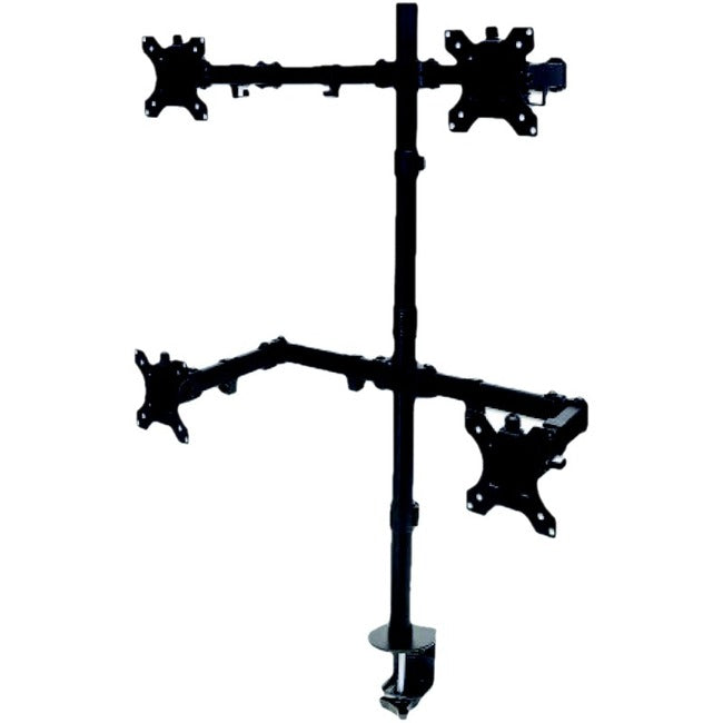 Constructed from durable die-cast metal, this four monitor mount features a sturdy clamp that allows for quick, easy and secure mounting without the need to drill holes into desks or countertops. Its fully adjustable tilt, rotate, side-to-side, height and tension settings create the perfect position to comfortably increase productivity. Such adjustment capabilities can even help reduce eye fatigue or neck and back strain. In addition, the mount pole offers easy monitor rotation to allow others to view presentations and multimedia productions from almost any direction.