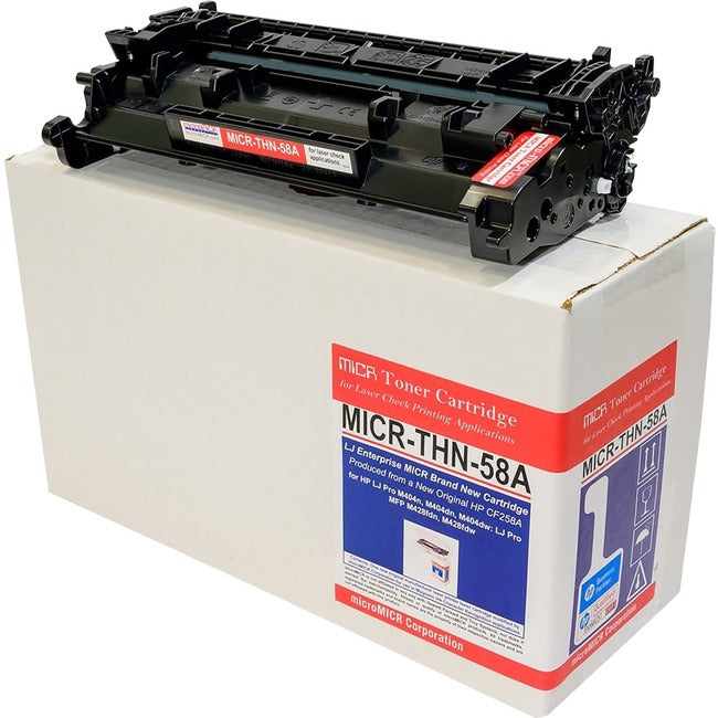Toner cartridge with new MICR toner is designed for use with HP LaserJet Pro M404dn, M404dw, MFP M428fdn and MFP M428fdw. Standard-yield cartridge contains magnetic image character-recognition ink for security purposes in printing checks. It uses special MICR toner developed and tested specifically for each model printer, retaining the original components and keeping the OEM factory seal intact. Cartridge yields approximately 3,000 pages.