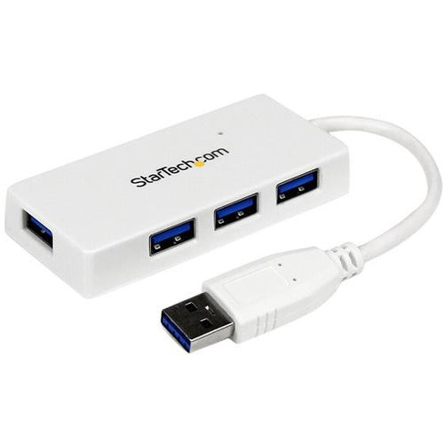The ST4300MINU3W Portable 4 Port SuperSpeed Mini USB 3.0 Hub (White) lets you expand your USB connectivity by turning a single USB 3.0 port into four external USB 3.0 ports. The integrated cable design makes this mini USB hub the perfect accessory for your Mac® / PC notebook or Ultrabook™ computer.