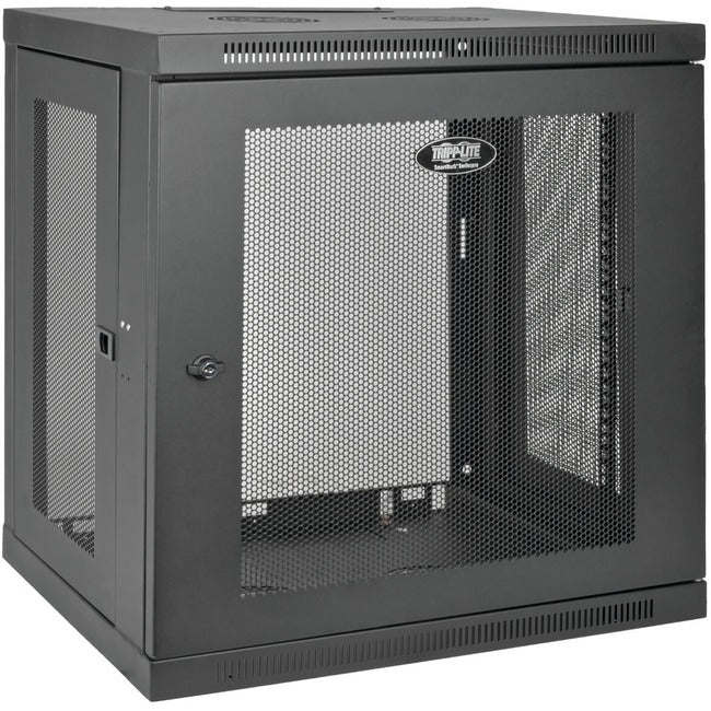 The SRW12U SmartRack 12U Low-Profile Switch-Depth Wall-Mount Rack Enclosure Cabinet is designed to house EIA-standard 19-inch rack equipment in network wiring closets, retail locations, classrooms, back offices and other areas with limited floor space where you need equipment to be secure, organized and out of the way. Constructed from heavy-duty steel with a durable black powder-coated finish, the cabinet has a maximum load capacity of 200 pounds.The side panels and front door lock securely to help prevent damage, tampering or theft. The front, top, bottom and removable side panels are vented, which allows air to flow freely and keep equipment cool. The reversible front door can open left or right by rotating the cabinet 180° before mounting. Convenient top and bottom ports allow easy cable routing. The SRW12U comes fully assembled and ready to mount to the wall, or use Tripp Lite's optional SRCASTER rolling caster kit to make it a mobile rack. Square and threaded mounting holes and numbered rack spaces make equipment installation easy. The vertical mounting rails adjust in 7/8-inch increments to accommodate equipment up to 16.5 inches deep, such as network switches and patch panels.