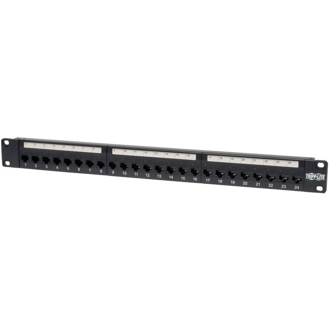 Tripp Lite's 24-Port Cat5e Feed-Through patch panel provides patching without punching down bulk wire to the back of the panel. Fully meets or exceeds Cat5e specifications - works with USOC, T568A, and T568B wiring. 19" width mounts easily in 2-Post Relay Rack, or a Wall-Mount Hinged Rack. Detachable cable management bar keeps patch cables neat and tidy on the back of the panel.