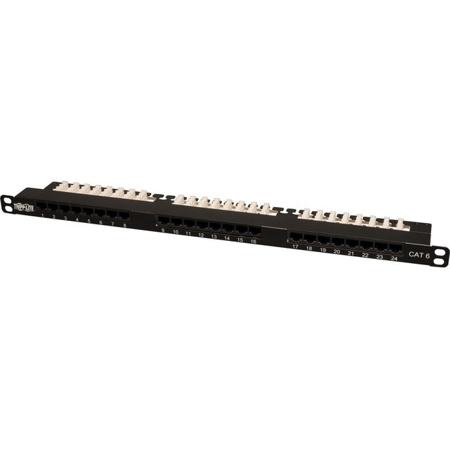 Tripp Lite N252-024-HU Cat6 patch panel frees up valuable rack space by condensing 24 RJ45 ports into a Half-U panel. This unique panel features built-in strain relief bar, allowing cables to be wire-tied ( 24 ties included ) to the bar, taking stress off the 110 punchdown connector. Tripp Lite's Category 6 Patch Panels offer you all the functionality and compatibility as any name brand. Each panel comes with 110-type termination, while meeting and exceeding EIA/TIA TSB-40 Cat6 connecting hardware specifications. Color coded for both EIA/TIA 568A & 568B installations. 24 ports ensure a wide range of plug-n-play options. The clear numbering on both the front and back of each panel gives you a quick and easy way to identify cable runs.