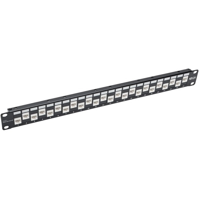 No 110 punchdown termination is required. Just plug your Cat6a cables into the 24 RJ45 coupler jacks on both sides of the panel. The detachable cable management bar keeps patch cables neat, tidy and efficiently organized on the back of the panel. Ports are clearly numbered and labeled to help you identify connections. This Cat6a feed-through patch panel mounts easily into 1U of an EIA-standard 19-inch rack. Compliant with the Federal Trade Agreements Act (TAA) for GSA Schedule purchases.