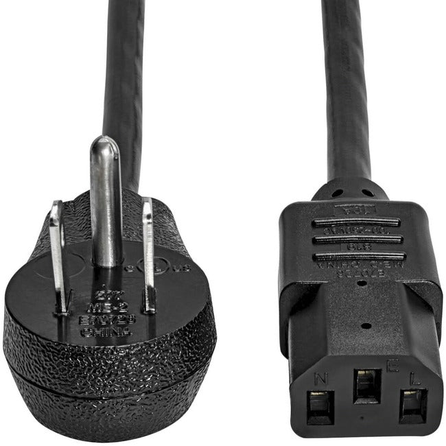 The angled NEMA 5-15P connector makes installations easier in confined spaces, such as the back of a rack enclosure cabinet. When plugged in, the right-angle plug guides the computer power supply cable parallel to the wall, allowing you to push furniture up against a wall to maximize space.