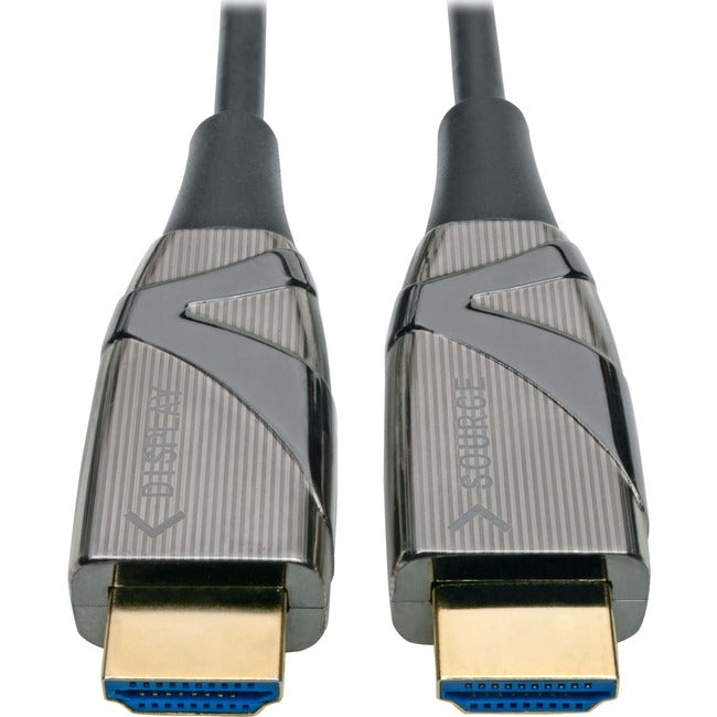 Because the fiber cable is slimmer and more flexible than standard copper HDMI cables, the P568-30M-FBR is easier to install around corners and in hard-to-reach spaces behind equipment. It draws power from the connected device, so no external power supply is needed to transmit the HDMI signal across the longer distances unique to fiber optic cabling. Note: the cable must be installed in the correct direction to function properly, so please check the Source and Display labels on the connectors before installation.