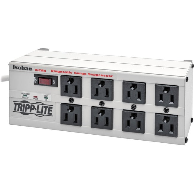 For more than 20 years, America's leading companies have trusted Tripp Lite's Isobar Premium surge and noise suppressors to protect sensitive computer, networking and telecom equipment. With more than 18 million satisfied customers, the Isobar remains the world's #1 selling premium surge suppressor. Loaded with a generous combination of high quality components, near indestructible all-metal case and unique noise filtration system, the Isobar offers the highest level of protection attainable in a multi-outlet strip. Robust surge suppression circuits with sine-wave tracking offer extreme levels of protection against the heaviest surge conditions exceeding IEEE 587 category A & B specifications and reducing 6,000V test surges to harmless levels under 35 volts. Isobar's unique protection system combines large toroidal chokes, ferrite rod-core inductors, HF/VHF capacitors and multiple layers of metal oxide varistors into exclusive isolated filter banks that remove EMI/RFI interference, even noise generated by other pieces of connected equipment. ISOBAR825ULTRA offers 8 outlets arranged in four filter banks to prevent system crashes, reboots and performance problems common as noisy system peripherals are powered off and on. Surge suppression rated at 3840 joules/97,000 amps offers network-grade protection. Widely spaced NEMA 5-15 outlets accommodate up to 4 large transformer plugs without blocking outlets. Diagnostic LEDs confirm power availability, line fault and protection status. Includes 25 foot AC line cord with space-saving angled input plug, keyhole mounting tabs and a set of 4 child safety covers.PLUG/OUTLETS: Input: NEMA 5-15P/Output: 8 NEMA5-15R/25-ft. AC line cordELECTRICAL: 120V AC, 50/60Hz (Requires NEMA 5-15R wall receptacle)SUPPRESSION: AC: 140V RMS Clamping/3840 joules/97,000 ampsFORMAT: Corded all-metal strip with transformer spaced outlets