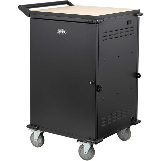 The laminated top acts as a smooth writing surface and holds a projector, monitor or other peripherals. Those external devices plug into two NEMA 5-15R outlets. You can also mount a flat-screen monitor or television using Tripp Lite's CSC36DM Display Mount Adapter Kit (sold separately). The storage cart is powered by a 10-foot cord and NEMA 5-15P plug that connects to a compatible AC outlet.