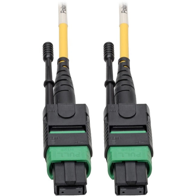 The N390-02M-12-AP is colored yellow for instant identification in a crowded switch or patch panel as a singlemode cable. Push/pull tab connectors are easily accessible in high-density data center environments and make the plug-and-play cable easy to install and remove with one hand.