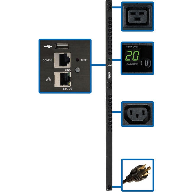 The PDUMV20HVNETLX 3.2-3.8kW Single-Phase Switched PDU provides advanced network control and remote power monitoring with the ability to turn on, turn off, reboot or lock out power to each outlet. Recommended for any IT or industrial application, it features 24 switched outlets (20 C13 and 4 C19) with included plug-lock insert sleeves to prevent cables from becoming accidentally disconnected. A 10-foot cord with NEMA L6-20P plug connects the PDU's C20 inlet to a compatible AC power source, generator or protected UPS.