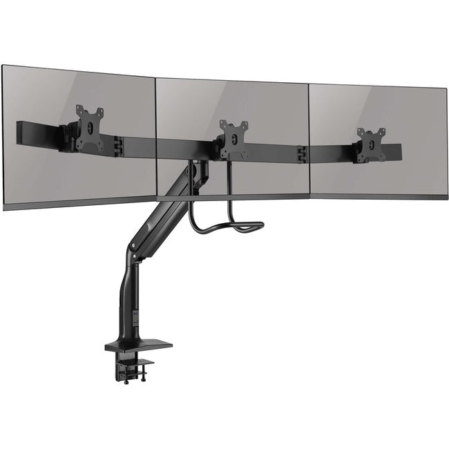 This Safe-IT™ desktop clamp mounts three flat- or curved-screen displays above your desk, table or workstation, allowing you to free up valuable surface space. Recommended for home or office use, the DMPDT1732AM fits most monitors from 17 to 32 inches. The durable aluminum frame tolerates frequent adjustments, and the swiveling aluminum arm supports three displays up to 14 pounds (6.5 kilograms) apiece. Instead of clamping the unit to your desktop, you may install it using the included grommet. All hardware is included.